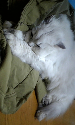 帰って来たら、服の上で寝てました。